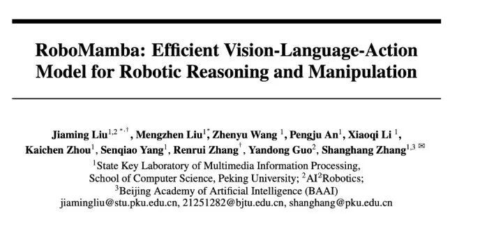 RoboMamba于2024年6月由智平方与北京大学等机构联合推出。该模型不仅比Physical Intelligence(Pi)团队的OpenVLA更早落地,还在多项“未见任务”的泛化能力上大幅超越谷歌RT系列等SOTA模型,成功入选全球人工智能顶会NeurIPS 2024,成为中国具身智能企业在VLA领域的首次国际亮相。