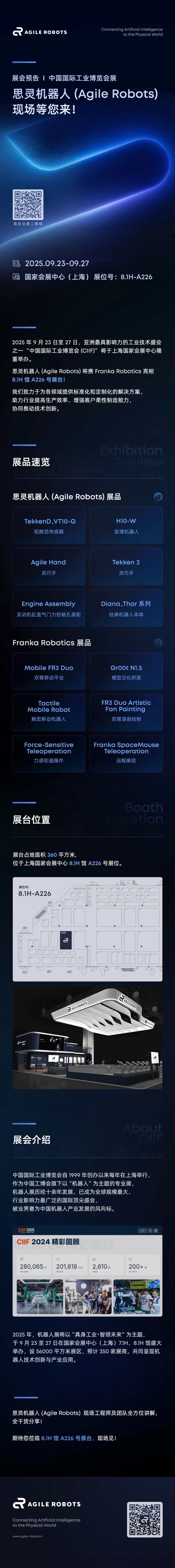 2025年9月23日至27日,亚洲最具影响力的工业技术盛会之一,“中国国际工业博览会(CIIF)”将于上海国家会展中心隆重举办。思灵机器人(Agile Robots)将携 Franka Robotics 亮相 8.1H 馆 A226 号展台!