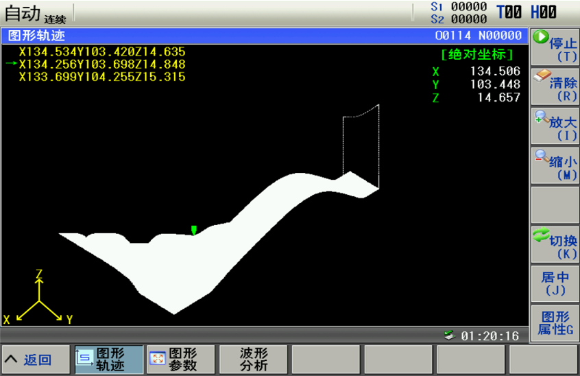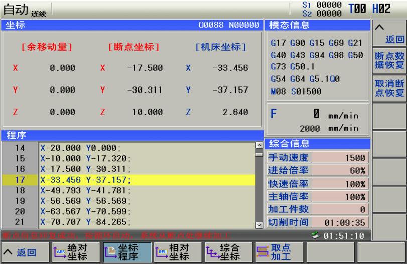 程序中断以后,只需通过“断点数据恢复”按键,一键恢复中断前的状态,从而实现对工件的继续加工。
