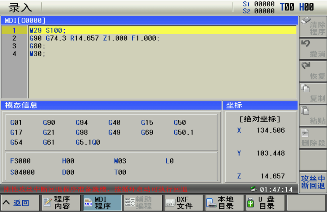 刚性攻丝时,因断电、复位等中断攻丝时,在录入方式下,可以通过一键生成回退程序,实现刚性攻丝退出。