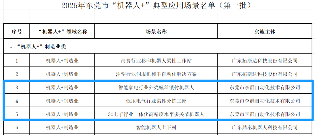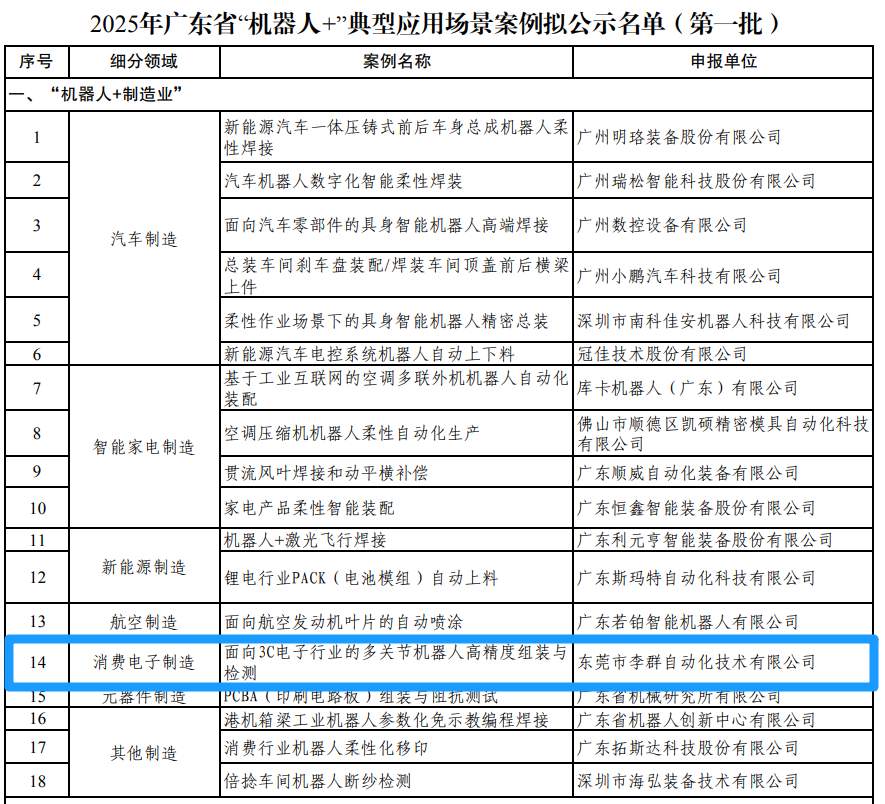 2025年6月,广东省为贯彻落实《工业和信息化部等十七部门关于印发“机器人+”应用行动实施方案的通知》《广东省人民政府办公厅关于印发广东省推动人工智能与机器人产业创新发展若干政策措施的通知》等文件要求,加快机器人推广应用,广东省人工智能与机器人产业创新发展工作领导小组办公室组织开展了“机器人+”典型应用场景征集工作。经过激励的竞争,李群自动化凭借“面向3C电子行业的多关节机器人高精度组装与检测” 案例成功突围,跻身全省48个首批示范项目之列。 李群自动化的入选并非偶然,作为国内首家拥有全品类机器人的企业,李群自动化深耕Scara机器人赛道多年。产品更是广泛应用于3C,食品,新能源等多个行业。而本次入选场景恰是能完美解决3C行业痛点的一体化高精度多关节机器人。其技术亮点可见以下: 高精度操作 机器人的重复定位精度达到±0.009mm(第1-2关节)和±0.006mm(第3关节),满足3C电子产品对高精度组装和检测的需求。 高效生产 机器人的标准节拍时间≤0.386秒,显著提升了生产效率。 快速换产 机器人采用模块化设计和智能控制算法,能够快速适应不同产品的生产需求,调试时间短,满足3C电子产品快速换产的需求。 复杂环境下的稳定性 机器人采用驱控一体化设计,摒弃了外置控制柜,减少了中间环节,增强了系统的稳定性和可靠性,能够在复杂环境中高效、稳定地工作。 QKM 与此同时,李群自动化还有3个案例入选了2025年东莞市“机器人+”典型应用场景名单(第一批)。 接连入选省市级首批名单公示,无疑是省市级部门对李群自动化技术方案在真实工业场景中的应用价值的高度肯定,充分印证了李群自动化在工业机器人领域持续的技术创新力、方案落地力与行业影响力。