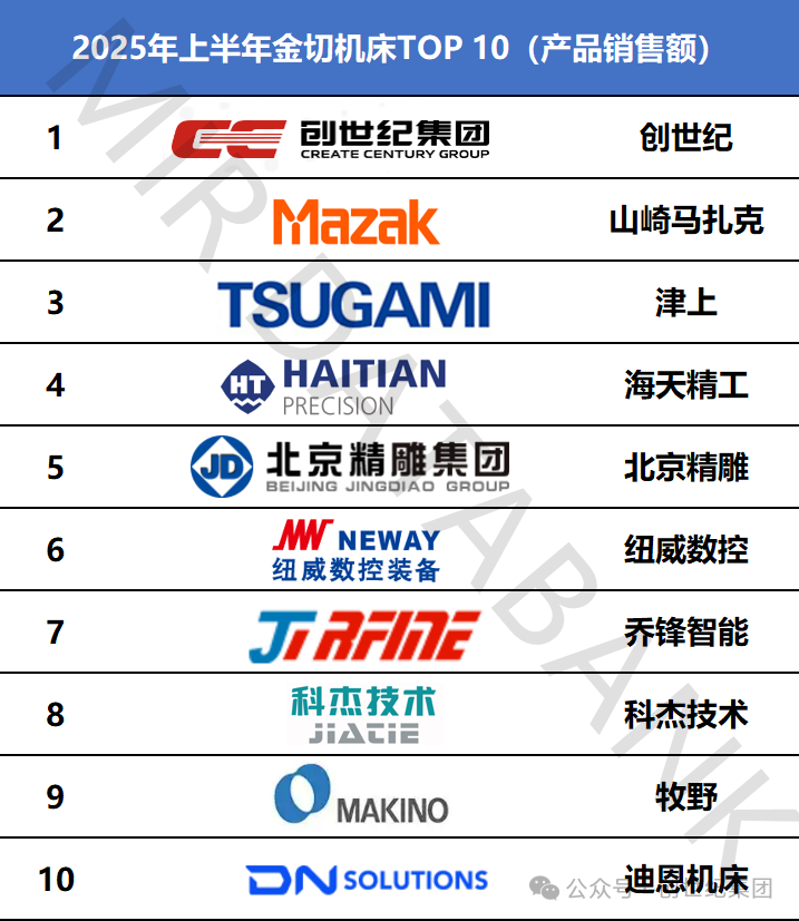 MIR DATABANK发布 图片数据来源MIR DATABANK 注:上表统计维度为2025年上半年金属切削机床的国内销售收入,不包括出口、售后服务、零部件等销售;地域范围:指中国大陆地区,不包括港、澳、台。 近日,权威机构MIR DATABANK发布《2025年上半年中国金属切削机床销售额TOP10榜单》,创世纪集团(股票代码:300083)成功入围并荣登榜首,再次印证其作为中国机床行业头部企业的硬核实力!报告显示,2025年上半年中国金属切削机床市场规模达375.9亿元,创世纪凭借“高端化、智能化、国产化”战略,为新能源汽车、航空航天、3C电子等关键领域提供精密加工解决方案,其业务发展与行业趋势形成正向呼应——2025年Q2中国金属切削机床市场规模同比增长10.2%,展现出中国制造在高端装备领域的发展活力。 中国机床的全球领跑者 创世纪作为国内技术宽度最广、产品最全的高端智能装备企业,自2010年深交所上市以来,已构建起覆盖研发、生产、销售、服务的全产业链体系。公司位列广东省制造业500强,拥有“1总部+5大生产基地”,并通过台群精机、赫勒精机、华领智能、霏鸿科技四大核心品牌矩阵,实现从通用加工到高端精密制造的全场景覆盖。 核心优势 研发团队:300+研发人员,含中、德、韩等多国专家,设立深圳、苏州、西安三大技术研究院; 核心专利:累计744件专利(发明专利109件、实用新型529件),自主研发BBT高速主轴、油气润滑系统、永磁同步电主轴等关键部件,自主设计与生产拥有自主知识产权的新型刀库。 核心品牌矩阵与产业布局 台群精机 ❏ 产品包括钻铣加工中心、立式加工中心、龙门加工中心、型材加工中心等 ❏ 台群精机凭借其丰富的产品线和卓越的技术实力,已成为国内机床行业的领先品牌,钻铣加工中心已累计出货超11万台,其中T-500B 获2022年《国家制造业单项冠军产品》 ❏ 产品覆盖3C消费电子/5G通讯基站/新能源汽车零部件/自动化设备/工程及医疗器械/航空航天等领域 赫勒精机 ❏ 专注高端机床产品的研发、生产,主要针对新能源汽车行业为主的销售和服务。以高精度、高效率和高稳定性为核心价值,致力于为客户提供高端机床智能化整体解决方案。推动高端机床国产化进程 ❏ 广泛使用于碳钢、不锈钢、钛合金加工,适用于新能源汽车、船舶、精密模具等多个行业 ❏ 拥有五轴加工中心、卧式加工中心、高精度数控车(铣)床、高速产线型加工中心等产品 华领智能 ❏ 华领智能拥有七大系列机床,单头/多头/多通道加工中心、双通道钻攻中心、双头钻攻中心、双头立式加工中心、龙门加工中心等 ❏ 适用于3C消费电子加工、硬脆材料加工、金属零件通用加工、高端模具加工、医疗等行业 ❏ 华领智能致力于以创新技术推动制造业高效率、低人工的加工升级,给加工领域带来高产、高效的加工应用和服务体验 霏鸿科技 ❏ 专注于高端五轴联动数控机床及其关键部件的研发、生产及销售,为客户提供高端数控机床解决方案 ❏ 现拥有4万多平米的花园式现代化厂房,涵括3千平米的恒温精密机械加工装配车间 ❏ 服务于航天航空、精密仪器、船舶、汽车、半导体及医疗器械等领域复杂、精密零部件的加工制造 全球布局:发展空间广阔 “1总部+5大生产基地”(深圳总部+湖州制造总部+东莞制造基地+苏州制造基地+宜宾制造基地+越南生产基地) ,未来,创世纪集团计划在海外多地建立营销中心和生产基地,让“中国智造”装备全球。 未来展望 攻坚高端,拥抱智能制造新机遇 高端品牌升级:为满足高端市场需求,发力“赫勒”“霏鸿”高端线,推出高速产线型卧式加工中心、五轴联动铣车复合加工中心、高精密数控车床等旗舰产品; 新兴市场深耕:针对新能源汽车、航空航天、智能机器人赛道,推出了一系列高效的解决方案; 数智化转型:AI智能机床,基于AI算法的智能控制系统,可实现加工参数自优化、故障自诊断,通过工业互联网实现设备互联与远程协同,动态补偿加工误差,将加工精度提升至微米级。 此次上榜是行业与客户对创世纪的认可,更是持续精进的动力。未来,创世纪将继续聚焦技术创新与客户需求,以更优质的产品和服务助力制造业升级,与中国制造业共同书写高质量发展的新篇章! -END-