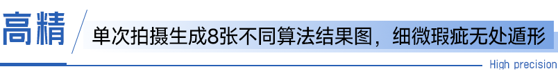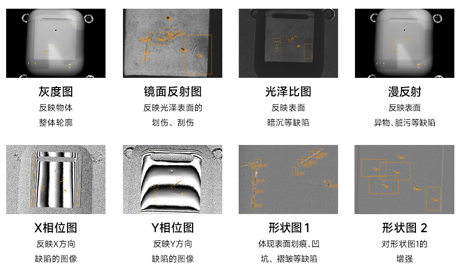 相机协同程控光源,结合PMD技术,实现单次2.5D成像同步生成8张不同算法结果图,精准呈现划痕、凹凸、脏污等各类缺陷细节。