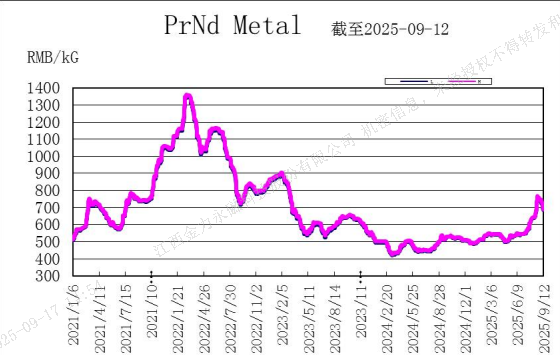 This week, PrNd metal prices saw minor adjustments, DyFe alloy prices remained stable, and Tb metal prices rose. Asian metal weekend prices: PrNd metal 698-703RMB/KG; Nd metal 775-780 RMB/KG; DyFe alloy 1570-1590 RMB/KG; Tb metal 8950-9050 RMB/KG.