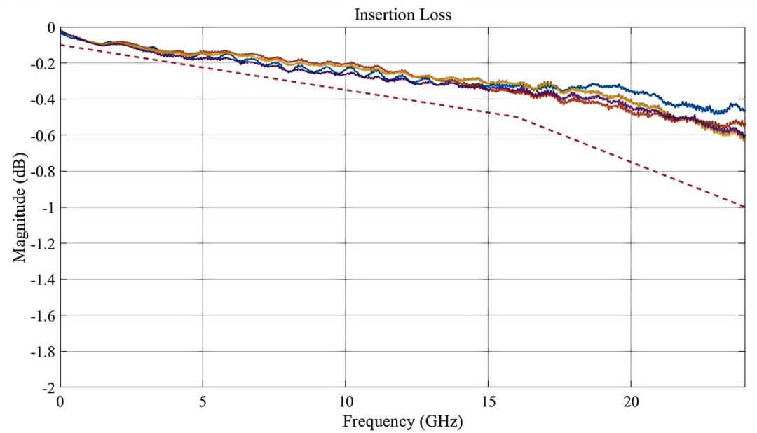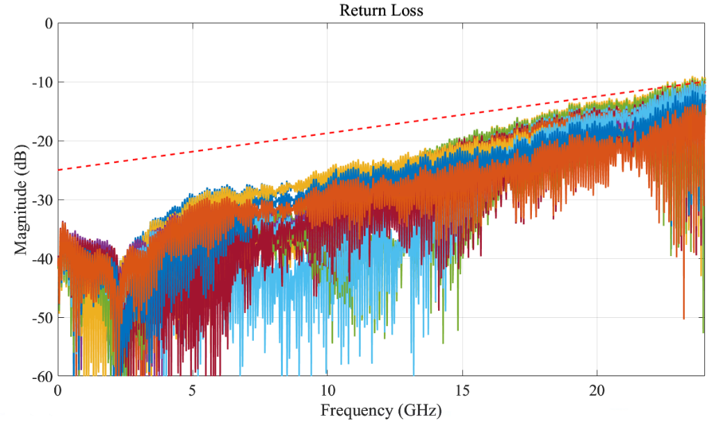 1、针对阻抗匹配进行了优化设计,其特性阻抗为85Ω±5Ω@15ps(20-80%),最大限度地减少了信号反射和失真。同时16对差分通道IRL计算最好可到-39dB,平均-35 dB,均远小于协会规范要求的-30dB。