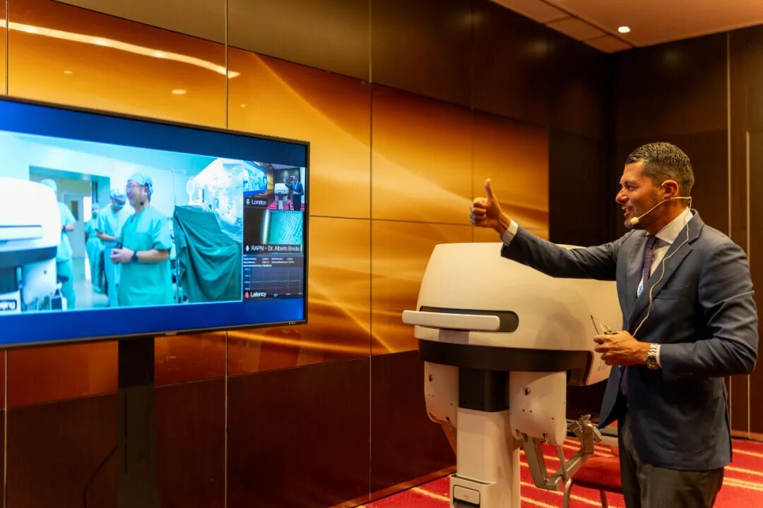 ERUS主席Alberto Breda博士坐在伦敦会场的精锋手术机器人主控台前,他的手部动作被精准转化为数字指令,通过精锋云®远程手术系统实时传输到8200公里外的中国北京,成功为中国人民解放军总医院手术室里的一名患者实施机器人辅助肾部分切除术(RAPN)。