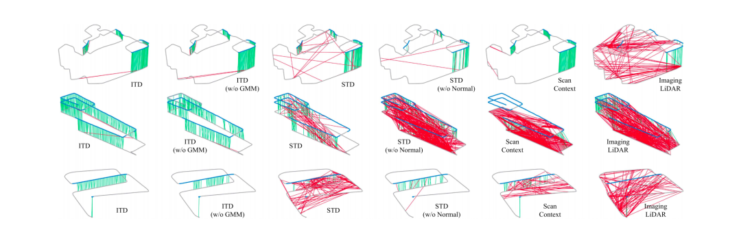 01.激光雷达(LiDAR)感知中的回环检测挑战 在当前的人形机器人产品中,激光雷达(LiDAR)作为主要感知传感器之一,广泛应用于环境建图、自主导航与避障路径规划等任务。相比于视觉传感器,激光雷达具备抗光照变化强、空间测距精度高的优势,已成为多种具身智能任务中的关键感知手段。而在基于激光雷达传感器的同时定位与建图(Simultaneous Localization and Mapping,SLAM)系统中,鲁棒的回环检测(Loop Closure Detection, LCD)对于纠正定位累计误差和提高建图精度至关重要,直接关系到人形机器人在多楼层建筑、狭窄通道或结构复杂环境中的稳定运行能力。 在实际应用中,SLAM系统是人形机器人实现长时间自主运行的核心能力之一,广泛用于高精度室内导航、跨楼层路径规划、动态障碍避让与任务区域重定位等任务。无论是在教育展馆、地下空间,还是结构复杂的工业场景中,只有具备稳定、精确的SLAM能力,机器人才能有效感知周围环境、持续进行空间建图并纠正自身位姿偏差,确保在动态变化环境中的可靠执行与交互。 然而,现有多数激光回环检测方法主要面向大尺度的室外场景,通过将3D点云结构化信息降维到2D平面来构建全局描述子,在狭窄的室内场景中会丢失大量的有效信息,从而限制了激光回环检测方法在兼顾室内外作业的人形机器人上的部署与应用。 02.ITD :赋予机器人不同尺度环境下6DOF回环检测能力 为了解决这一难题,由中国科学院自动化研究所团队提出了一种基于高分辨率旋转LiDAR强度图像构建的强度三角描述子(Intensity Triangle Descriptor, ITD)。ITD将图像特征点的空间位置与其邻域反射强度纹理信息结合,通过高斯混合模型(Gaussian Mixture Model, GMM)赋予3D关键点强判别性,并通过刚性三角拓扑结构构成全局描述子。随后,基于边长与GMM相似度的两阶段回环检测方法有效提升了检测的效率和精度。ITD在结构化、退化及非结构场景中的实验表现表明,该方法在保持低计算成本的同时,显著提升了回环检测的召回率和准确率,展现出良好的环境适应性与部署潜力。 ITD系统框架 作为灵宝CASBOT技术体系的深度合作团队,中国科学院自动化研究所在具身智能方向具备长期、系统性的理论研究能力,并持续产出面向复杂场景的前沿成果。ITD的提出,是灵宝CASBOT背后科研力量深耕“场景导向和技术自研”路线的重要体现,也为灵宝CASBOT的人形机器人产品在多样化环境中实现稳健感知与精准空间理解提供了核心支撑。 具体来看,ITD主要有以下三项核心贡献: 提出基于LiDAR强度图像的三角拓扑全局描述子ITD,有效融合图像纹理与空间结构信息,提升回环检测在非结构化和退化场景下的鲁棒性,直接提供6DOF回环位姿约束。 ITD采用图像特征点融合多帧空间位置进行关键点提取,并结合邻域反射强度估计GMM签名,构造高判别性全局描述子,扩大感受野同时减少误匹配。 ITD的两阶段回环检测机制利用边长搜索与GMM相似度计算进行候选检索,再通过几何验证实现精确匹配,确保回环检测的准确性。 03.提升描述符稳定性与判别性的关键点建模策略 ITD通过对多个连续帧的图像特征点在三维空间中进行累积,避免了单帧噪声点的不稳定性,具体策略包括: 图像特征提取:使用FAST算法从LiDAR强度图中提取2D角点。 多帧配准累积:通过LiDAR里程计将连续帧特征点对齐累积至关键帧,增强结构一致性。 体素降采样+非极大值抑制(NMS):对累积点云进行体素降采样,并利用局部密度进行冗余剔除,保留代表性强、分布均匀的关键点。 此外为增强描述子的判别能力,每个关键点被进一步结合其图像邻域纹理进行建模: 1.邻域强度图像块采样:提取每个关键点3×3邻域内的强度图像像素值; 2.GMM建模:采用高斯混合模型(Gaussian Mixture Model)估计其强度分布特征(权重、均值、方差),并用9维向量表示每个关键点的强度签名。 与传统点云法依赖局部几何法线不同,GMM更能反映纹理特征的差异性,增强关键点在场景间的区分能力。 04.基于ITD的两阶段回环检测机制 为实现高效、准确的回环检测,在强度三角描述符的基础上,设计了一个两阶段匹配机制,分别负责候选检索与几何验证,以提升算法的精度和召回率。 首先使用增量式kd-tree来索引每个描述符的边长,并采取以下策略筛选出候选历史描述符: 三边长距离匹配:先根据三角形边长在特定半径范围内快速筛选相似三角形。 GMM相似性计算:引入设计的GMM相似性函数,比较描述子中三个关键点的强度分布是否一致,用于进一步精细筛选候选。 其中是阶跃函数。 为剔除外点并确认匹配的几何一致性,采用了鲁棒的几何验证算法: SVD姿态估计:使用奇异值分解(Singular Value Decomposition,SVD)对当前帧与候选帧间的匹配三角形进行刚体配准,估算6自由度相对变换。 RANSAC筛选:结合匹配点对的几何一致性,使用RANSAC算法过滤离群匹配对,保留内点集合。 05.ITD的多场景实验验证:精度、效率与适应性的全面提升 在回环检测精度上,通过在多个公开数据集(FusionPortable、STheReO)和自建LiDAR数据集(涵盖公园、郊区道路等)上进行了系统性评估,实验采用AUC、F1最大值和扩展精度(EP)作为评估指标。实验结果显示,ITD在所有场景中均优于当前主流方法,如STD、Scan Context和Imaging LiDAR。 最大F1分数下不同方法的回环检测结果(绿线为正确匹配,红线为错误匹配),由上而下为城市道路序列、室内走廊序列和郊区道