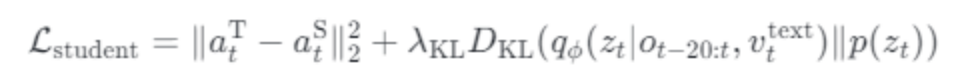 目标:将教师策略的能力迁移到仅依赖语言指令和本体感知的部署策略。