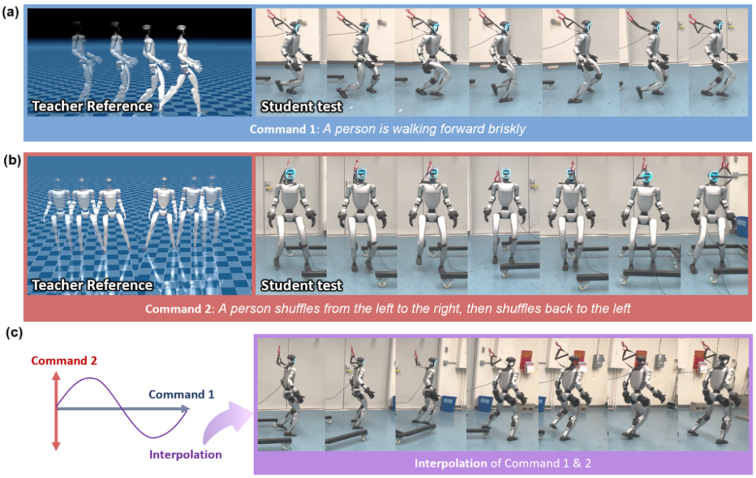 通过将当前观测值和经过CLIP编码的文本通过CVAE编码器编码为潜在编码,然后再经过CVAE潜在空间中对它们进行插值并解码以生成相应的动作来实现。例如生成了'斜向行走'等训练集中不存在的新动作。