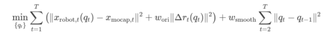 基于Levenberg-Marquardt算法的逆向运动学,优化目标函数,使得人类MoCap(动作捕捉)数据适配机器人动力学(如关节限制),目标函数如下: