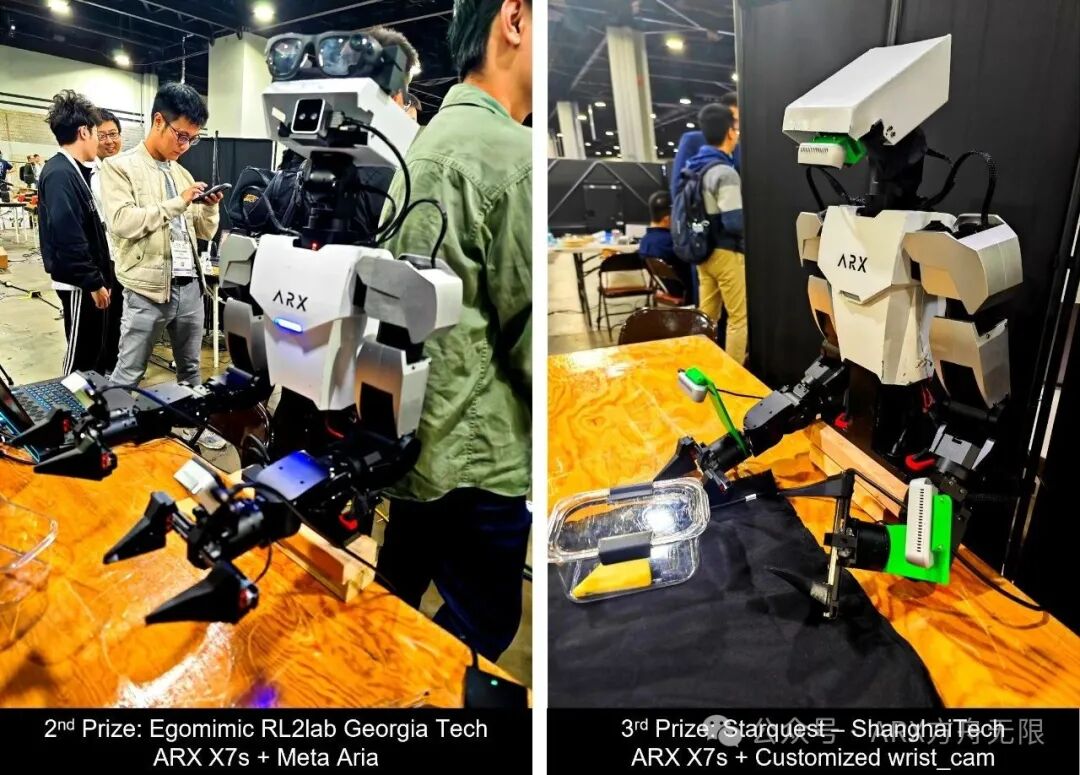 值得一提的是,ARX-X7s能够轻松兼容各种硬件的拓展开发,例如亚军团队与Meta眼镜的组合二次开发,以及季军团队的自定义相机支架: