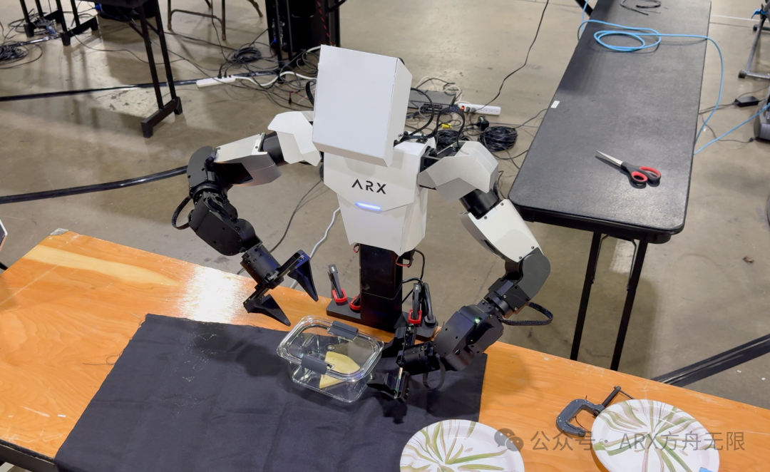 WBCD餐桌服务挑战赛道的负责人,黄迪介绍,选手们需要使用方舟无限的ARX-X7s机器人完成铺桌布,摆放食物和妥善打包食物等日常桌面任务。这些看似人类轻而易举能够完成的任务,其背后涉及到长程柔性操作任务,精细操作和力反馈操作任务和抓取操作,对机器人数据采集方式和自动部署算法来说具有相当大的挑战!