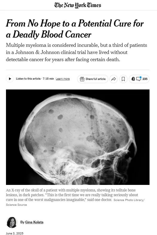 说明 (《The New York Times》(纽约时报)于2025年6月3日头版报道。以下内容为中文翻译版,如有任何不一致的地方,应以英文原稿为准,原链接详见本文末左下角“阅读原文”。) 多发性骨髓瘤一直被视为不治之症,但在强生公司一项临床试验中,三分之一注定死亡的患者在接受治疗后数年未检测出癌细胞。 97名患者长期患有多发性骨髓瘤,一种被医生认为不可治愈的常见血癌,而且他们将面临在一年内必然且极度痛苦地死亡。 这些患者尝试过一系列治疗,每种治疗虽能暂时控制病情。但癌症总会卷土重来。在穷尽所有方案后,他们只能接受等待临终关怀。 作为最后一搏,这些患者接受了免疫疗法的临床试验。 其中三分之一患者反应非常好,他们获得了惊人的缓解。这种由传奇生物,一家成立于中国的公司研发的免疫疗法几乎让他们的癌症消失了。五年后,这些患者的癌症仍未复发,这种结果在该疾病史上从未有过。 这些在曾陷入绝望的患者中取得的疗效,让一些久经战阵的美国肿瘤学家敢于提及'潜在治愈'这个词。 '在我从事肿瘤学领域30年里,我们从未讨论过骨髓瘤的治愈,'美国国家癌症研究所前所长、现北卡罗来纳大学医学院癌症政策与创新教授Norman Sharpless博士说,'这是我们第一次严肃探讨治愈一种最凶险的恶性肿瘤。' 这项由强生公司资助的研究(强生与传奇生物签订了独家许可协议)已于6月3日在美国临床肿瘤学会(ASCO)年会上公布,并发表在了《临床肿瘤学杂志》(The Journal of Clinical Oncology)上。 宾夕法尼亚大学的Carl June博士指出,美国每年有3.6万名骨髓瘤患者,正饱受骨骼被癌细胞侵蚀的痛苦——“患者的骨骼看起来像被凿出一个个孔洞,最终导致骨骼塌陷。”他曾经接诊过身高缩短6英寸的患者。 '这种死亡过程极其痛苦,现阶段,晚期骨髓瘤就是判死刑。'(June 博士持有其所属大学拥有的免疫疗法专利) 过去二十年间,虽然治疗手段有所进步,将患者中位生存期从2年延长至10年,但无治愈的先例。 这项新发表研究的首席研究员、北卡罗来纳州Atrium Health Levine癌症研究所和维克森林大学医学院的Peter Voorhees博士解释,患者通常要经历反复治疗,直到癌症占上风——对每种药物都产生耐药性。 最终陷入无药可用的境地。 传奇生物开发的是一种称为CAR-T的免疫疗法。该疗法通过提取患者自身白细胞,经基因改造使其具备攻击癌细胞能力后再回输体内。这种疗法已经彻底改变了白血病等其他血液癌症患者的前景。 然而,CAR-T细胞制备过程是一门艺术——其中存在太多变量,很难找到一种有效的方案。而且它可能引发高烧、呼吸困难和感染等严重副作用,患者在接受治疗后通常需要住院数周。 但传奇生物成功开发出一种针对多发性骨髓瘤的有效疗法,让质疑者们大跌眼镜。 八年前,这家中国公司因其 CAR-T疗法发表的夸张声明而备受关注,这曾遭到美国研究人员的嘲笑。 然而,强生公司正在寻找一款属于自己的CAR-T疗法。因此,这家美国制药巨头肿瘤学部门的高管Mark Wildgust表示,该公司派出了科学家和医生前往中国,以核实这些说法是否属实。 '我们逐个地点核查了结果,'他回忆道。 最终,强生信服了,随即与传奇生物启动了合作,开始在至少经历一线标准治疗失败的骨髓瘤患者中开展临床试验。与接受标准疗法的患者相比,接受免疫疗法的患者在疾病未进展的情况下活得更久。 该疗法在这一有限的适应症获得了监管批准,并以Carvykti为商品名进行销售。研究并未确定这种高难度的治疗是否延长了生命。 这项新研究承接了不同的挑战——帮助那些经过多年治疗已走到末路的患者。他们的免疫系统已被严重损耗。用肿瘤学家的话说,这些患者'经过了多重治疗'。因此,尽管CAR-T疗法旨在刺激免疫系统以对抗癌症,但尚不确定这些患者的免疫系统能否堪当。 肿瘤学家表示,尽管大多数患者未能清除癌细胞,有三分之一的患者能够做到已是非凡的成果。 为了解这些患者若不接受免疫疗法的预期寿命,强生公司查阅了注册系统中与研究患者情况相似的数据——这些患者的所有治疗均告失败。他们的生存期约为一年。 对于研究受试者中癌细胞消失的患者之一,来自纽约的Anne Stovell来说,这个结果好得令人难以置信。 她表示,自2010年被确诊为癌症后,她尝试过九种药物来控制癌症,其中一些产生了可怕的副作用,但最终都宣告失效了。 接受传奇生物CAR-T治疗的过程很艰难——她说自己在医院住了近三周。但自从六年前接受治疗后,她已经没有任何癌症迹象。她说至今仍难以相信自己的骨髓瘤已经消失了。任何新的或者旧的疼痛——都会带来恐惧。 '心里总埋着一颗怀疑的种子,'她说。 但经过一次次检查,癌症都未复发。 '每年做骨髓活检时,我都如释重负,'她说道。 骨髓瘤专家们对这些结果表示赞赏。 与许多其他癌症治疗一样,多发性骨髓瘤的治疗费用高昂。June博士称这些药物'贵得离谱',每年花费超过10万美元。 June博士表示,多年治疗总费用可能高达数百万美元,通常由保险公司承担,'而且甚至不能治愈'。 CAR-T疗法也很昂贵。Carvykti的标价为555,310美元。但这是一种一次性疗法。更重要的是,如果能在病程早期使用,或许可以实现早期治愈。 强生公司正在验证这一设想。 未参与该项研究的丹娜-法伯癌症研究所骨髓瘤专家Kenneth Anderson博士表示,如果将这种疗法用作一线