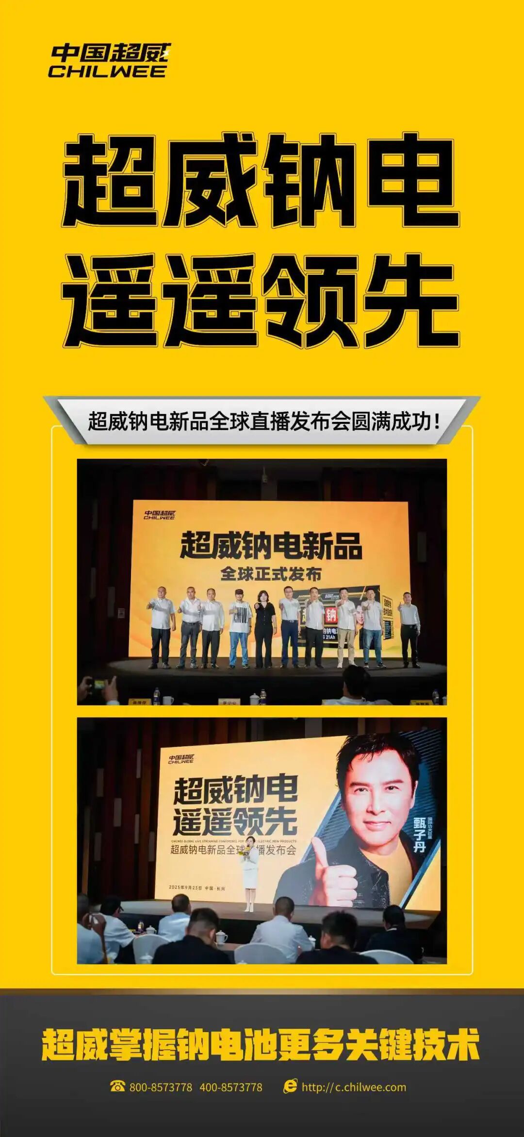 启动仪式上,由超威集团品牌形象代言人甄子丹全新演绎的钠电广告片震撼首映。这不仅是一部宣传片,更是超威钠电的全球名片,是科技与艺术交融的杰作,向世界传递属于超威的品牌强音!