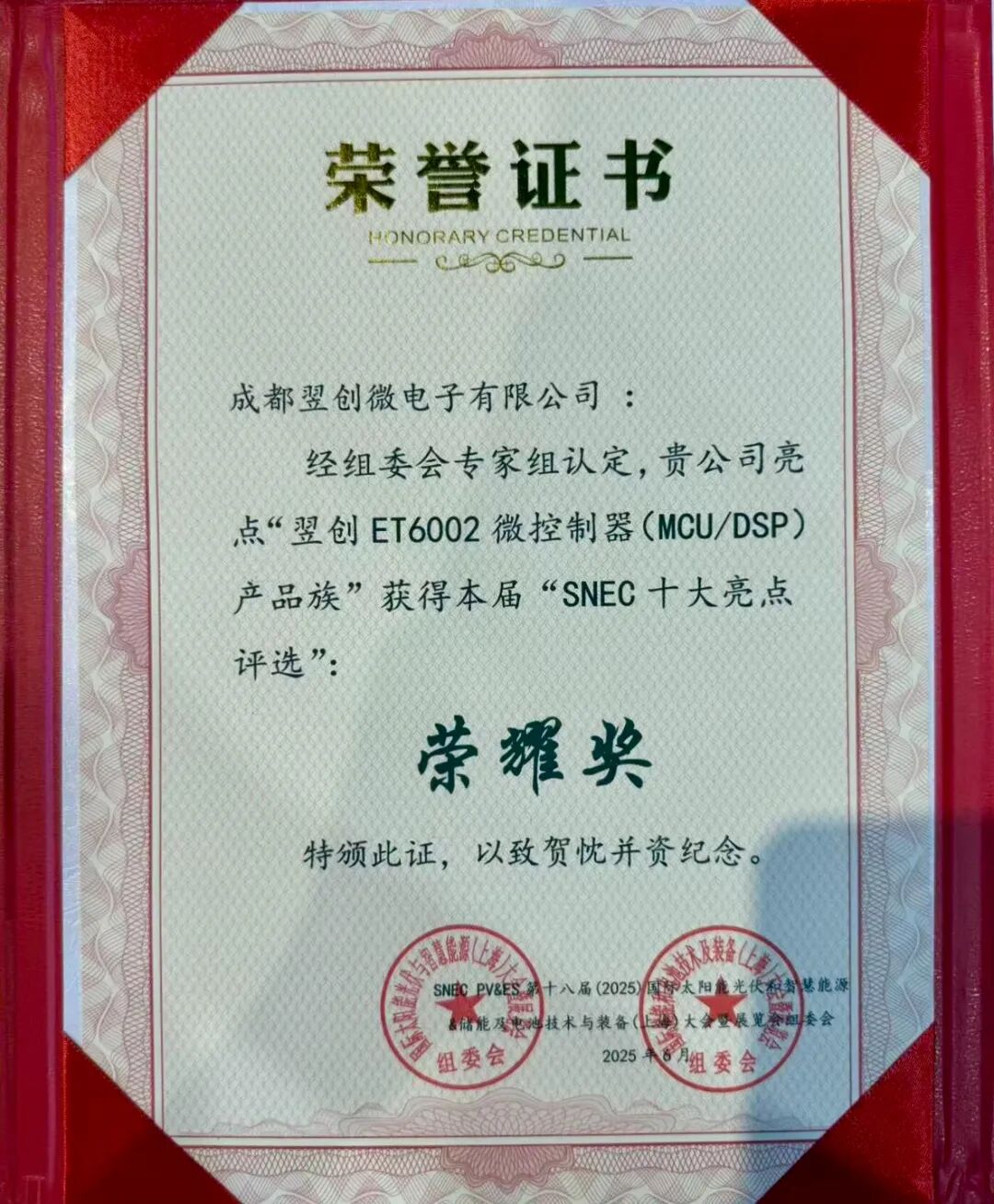6月13日,SNEC PV+ 第十八届(2025)国际太阳能光伏与智慧能源(上海)大会暨展览会(以下简称 SNEC展)在上海国家会展中心圆满落幕。本届展会上,翌创微电子凭借ET6002微控制器(MCU/DSP)产品族的技术实力和创新能力,荣获第18届SNEC展十大亮点“荣耀奖”。