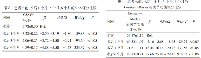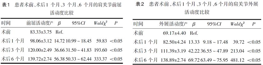 结果:采用广义估计方程对两组患者术前、术后1 个月、3 个月、6 个月的肩关节前屈及外展活动度、VAS评分、Constant-Murley肩关节功能评分进行比较。所有统计检验均采用双侧检验。设P<0.05为差异有统计学意义。