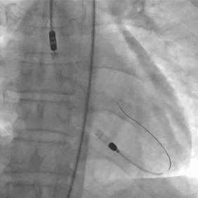操作要点:DSA引导下穿刺左侧股动脉,置入配套可撕开导管鞘;导管跨主动脉弓及主动脉瓣,DSA实时定位后启动系统。
