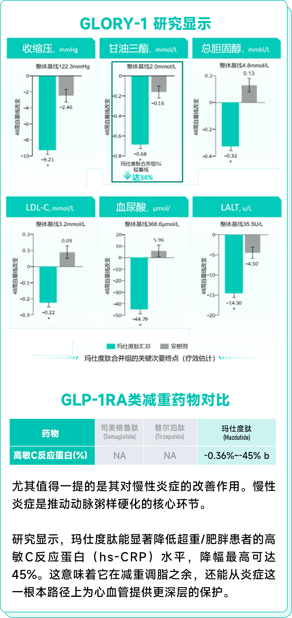 以前觉得胖点没啥:牛仔裤扣不上就换条松紧的,自拍找好角度就行,最多防着脂肪肝、糖尿病。 可谁能料到,那圈看着没啥杀伤力的脂肪,竟是藏在血管里的 “隐形炸弹”,也会悄无声色的给心血管 “埋雷”。 想象一下,你每天背着一个10公斤的背包生活,是什么感觉?对我们身体来说,多余的体重就是这个“永恒的负重背包”。 我们的心脏🫀,这位任劳任怨的“劳模”,为了把血液泵到全身,就得使出更大的力气。长期超负荷工作,会导致什么呢? 01 心脏负荷加重 体重增加,全身血流量上升,心脏不得不“加班”泵血,长期下来容易引发高血压。 02 血脂异常 多余脂肪进入血液,导致血脂紊乱,严重时可诱发心梗、脑梗。 03 心脏供血受阻 肥胖常伴随活动减少,冠状动脉侧支循环减弱;脂肪若沉积在心包,还会限制心脏搏动,增加猝死风险。 有研究指出,肥胖者患冠心病的风险是体重正常者的3–4倍。《中国心血管健康与疾病报告》也显示,超重和肥胖人群患上高血压的风险,是正常体重人群的2-3倍! 美国一项针对11.6万人的调查也显示,30–50岁肥胖女性患心脏病的风险约为正常体重女性的3倍[6]。 肥胖和心血管疾病就像一对难兄难弟,肥胖会导致多种心血管疾病,是心血管疾病的独立危险因素;同时研究又显示,超三分之二的肥胖相关死亡最后可归因于心血管疾病[7]。 也就是说,肥胖造成心血管疾病,最后“胖子们”又会因心血管疾病死亡。所以科学减重,不仅能改善身体代谢,更是对心脏最重要的保护,对生命的保护。 看到这里,别焦虑!好消息是,你不需要立刻变成模特身材才能获益。研究表明,哪怕只是减掉总体重的5%-10%,对心血管的益处都是巨大的! 对于一个90公斤的人来说,减掉4.5-9公斤,你的身体就会发生一系列神奇的“正向连锁反应”: 除此之外,还有研究表明,长期持续的体重减轻与房颤负担的显著减少和窦性心律的维持呈正相关[8]。 既然减重能为心血管疾病风险带来获益,那你一定很想知道:有没有一种方法能同时实现: 玛仕度肽应运而生!作为全球首个且唯一获批的 GCG/GLP-1 双靶减重降糖药。 它不搞单靶点药的 “单打独斗”,激活双靶点自带 “抑制食欲 + 加速燃脂” 双 buff,轻松破局~ GLP-1 是 “食欲管家” GCG 堪称 “脂肪粉碎机” 能指挥肝脏高效运转,既抑制脂肪合成,又促进脂肪酸氧化,还能将白色脂肪转为 “产热小马达” 棕色脂肪直接燃脂; GLP-1R和GCGR双靶点协同调节血糖稳态,实现高效燃脂、高效控糖。 要知道,[甘油三酯]可是心血管疾病的 “危险同伙”,指标一高风险就跟着涨! 而玛仕度肽刚好能搞定甘油三酯,给心血管添保障,临床试验更是交出超硬核答卷:34% 降脂 & 80% 减肝脂[2-4]!直接实现减重、调代谢、护心三不误~ 针对中国超重人群的 GLORY-1 研究显示,它能让甘油三酯较基线暴跌 34%[1] ,这比很多单靶点减重药都给力。 更惊喜的是它还能带来多重代谢改善:收缩压降了、血尿酸少了、肝功能指标也跟着降了,心血管风险因素直接被挨个 “清零”! 在《塑造健康——2025体重管理产业会议》上,来自上海交通大学医学院附属瑞金医院陈桢玥教授表示: 代谢是一个相互作用的网络,包含肥胖、高血压、血脂升高等因素,最终可能引发病理生理改变。 代谢异常分为5 期:从 0 期健康人,到 1 期胖或胰岛素抵抗,再到 4 期引发冠心病、心衰,步步升级。 有效管理超重和肥胖可阻断系列病理反应,避免后续代谢危险因素及疾病发生,契合「上医治未病」的理念——干预肥胖的最终目的是预防危险因素及疾病状态的出现。 尽管「管住嘴迈开腿」也能干预肥胖,但实际坚持难度较大。而玛仕度肽的出现不仅可加速帮助超重肥胖人群减重。 同时通过改善肝脏脂肪沉积及相关风险因素,改善心血管等多重代谢指标,最终带来心血管获益。 不需要你瘦成一道闪电,只要迈出一小步,你的心脏就能感受到巨大的善意。这简直就是“性价比”最高的健康投资! 而当单靶点制剂还在 “单打独斗”,新型 GCG/GLP-1 双受体激动剂已经 “全面升级”! 不光减重效果更能打,调代谢的作用也更给力,最终能给患者带来的临床获益自然也更大。 写在最后: 肥胖引发心血管病找对治疗方案才重要!像玛仕度肽,既能减重调代谢,还能帮心血管💖获益。 But!即使用药也得配运动 + 健康饮食,可以稳住 “代谢重启”效果,才能真正终结恶性循环~ 毕竟,一颗强壮而快乐的心脏,才是我们奔赴山海、享受生活所有美好的最强引擎!推动高血压、血脂紊乱,使心梗、卒中风险成倍增加;
