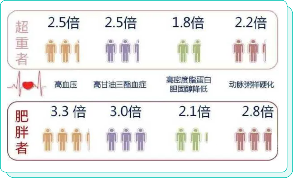 有研究指出,肥胖者患冠心病的风险是体重正常者的3–4倍。《中国心血管健康与疾病报告》也显示,超重和肥胖人群患上高血压的风险,是正常体重人群的2-3倍!