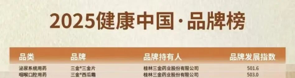 在健康产业颁奖盛典上,三金®三金片及三金®西瓜霜凭借良好品牌口碑与出色的市场表现在200个杰出品牌脱颖而出,双双荣登“西普金奖·2025健康产业品牌榜”。