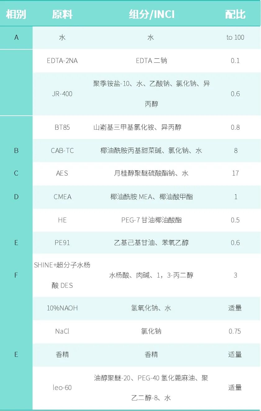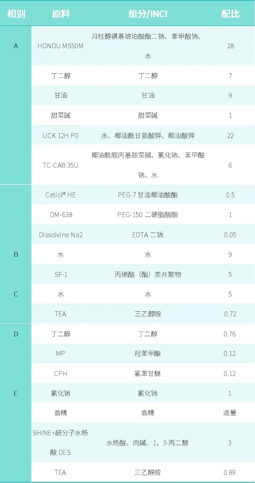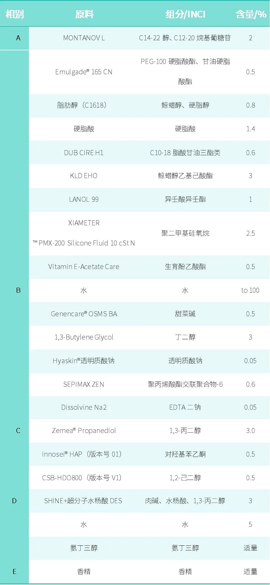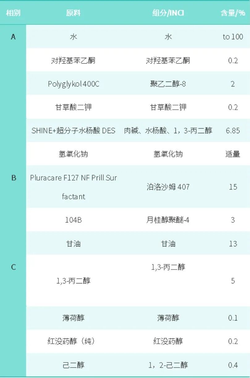 基于SHINE+超分子水杨酸DES的理化性质,杉海创新配方部开发了多款应用配方,覆盖面部护理和头皮洗护领域。下文给大家分享4款以该创新专利原料为核心原料的配方,为开品提供参考: