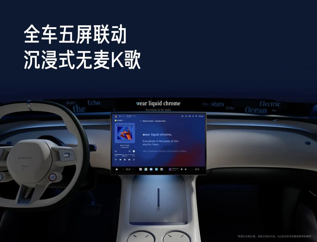 比如沉浸式无麦 K 歌:在驻车时候可以和朋友一起唱歌,小米天际屏还可以全屏歌词,5 屏联动,氛围感拉满。
