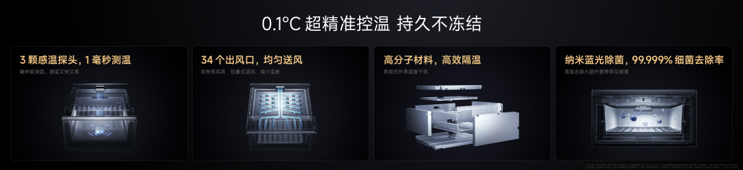 它内置了 3 颗高精度的感温探头,能做到 1 毫秒感温,温度一旦波动能快速调整。还有 34 个出风口,像鱼骨一样,均匀覆盖整个专区,让冷气充盈,减少温度波动。同时外层还包裹了高分子材料,让专区高效隔温,不被干扰。加上纳米蓝光除菌灯,能更好地除菌,同时延长保鲜时间。