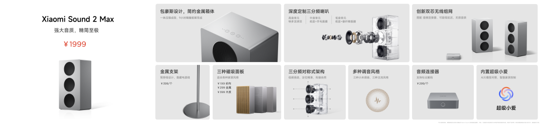 Xiaomi Sound 2 Max 每台定价 1999 元。还有丰富配件可供选择,自定义你的专业家庭扬声器。