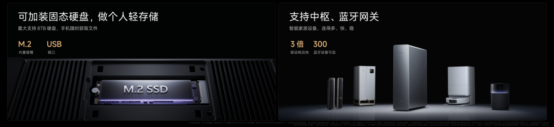 它还是全屋设备、数据的控制中心。首先备受好评的存储扩展功能回归,可以外接固态硬盘,不仅支持 USB,还升级了 M.2 插槽,最大可支持 8TB,用来做个人存储,存照片、存视频、出门在外获取家中的重要文件,都非常方便。同时,还内置智能中枢网关、蓝牙 Mesh 网关,能让全屋智能家居联动响应快 3 倍,还能连接 300 台小米蓝牙设备,让智能家居的控制又快又稳。