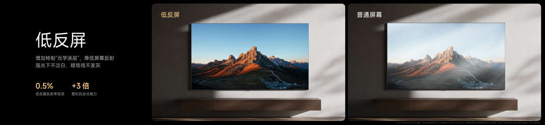 这一次还全新升级了“广视角低反屏”,低反涂层反射率低至 0.5%,整机抗反光能力比普通电视提升了 3 倍,做到了“强光下不泛白,暗场戏不发灰”,同时最佳观看视角也提升了 30%,能实现正看、侧看,色彩还原都非常好。