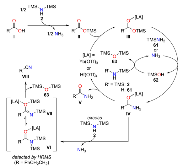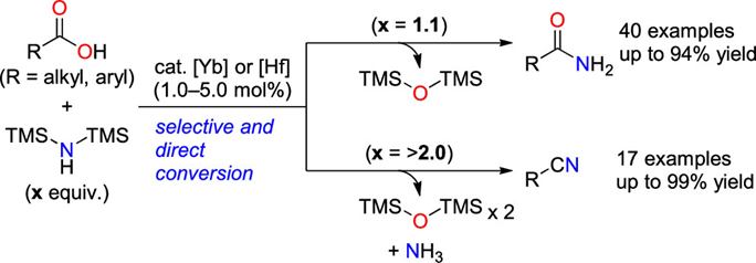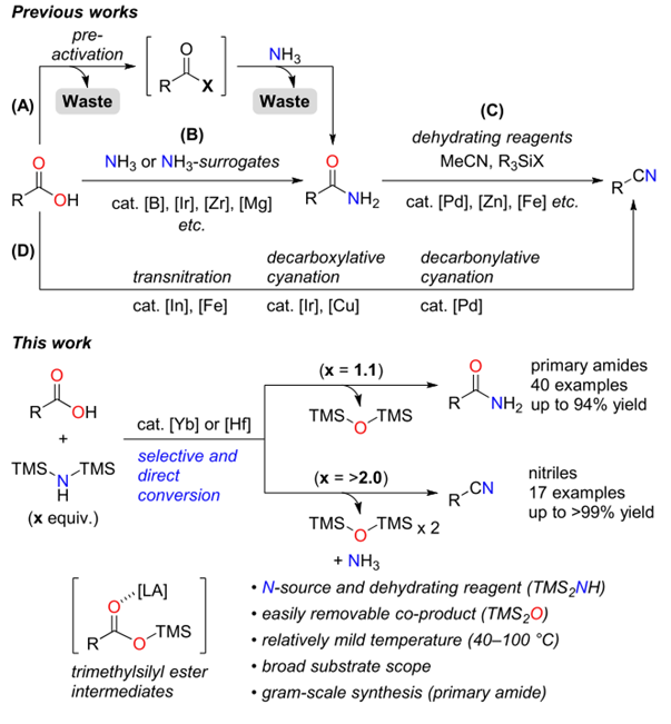 Kataoka et al. reported a Lewis acid-catalyzed direct conversion of carboxylic acids into either primary amides or nitriles using bis(trimethylsilyl)amine (TMS2NH) as an ammonia surrogate. In the presence of Yb(OTf)3, Hf(OTf)4, a wide range of aromatic, heteroaromatic, and aliphatic carboxylic acids were transformed into primary amides in high yields with broad functional group tolerance. Increasing the equivalents of TMS2NH enabled one-pot dehydration of the intermediate amides to deliver the corresponding nitriles, providing a tunable and practical protocol for selective product formation. Mechanistic studies revealed that in situ generated trimethylsilyl esters act as key intermediates and that ammonia, released from TMS2NH, functions as the actual nucleophile. The method features operational simplicity, scalability, and avoidance of toxic cyanide sources, offering a sustainable approach to access nitrogen-containing scaffolds widely relevant to pharmaceuticals and materials chemistry.