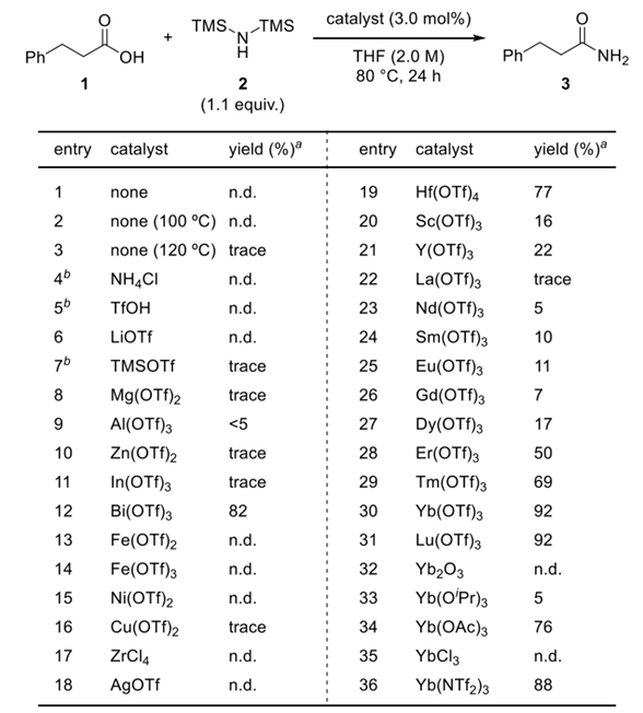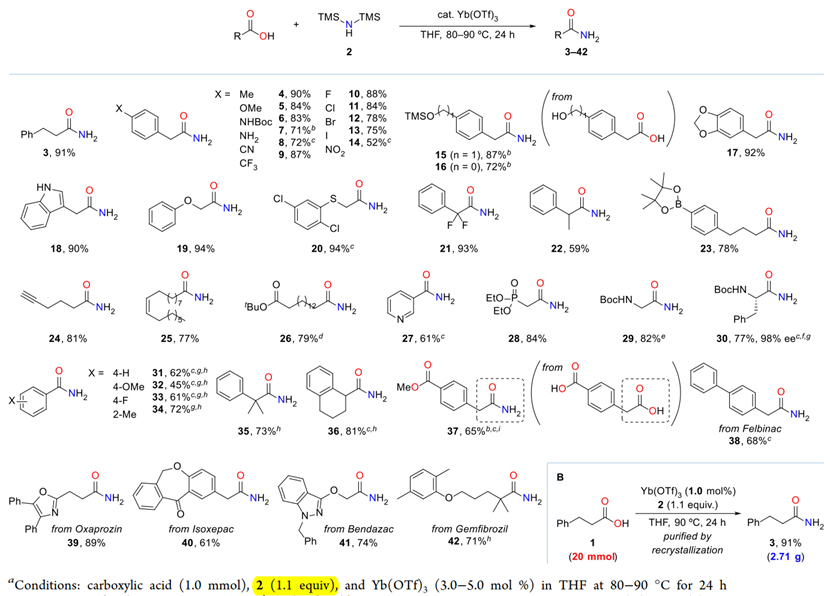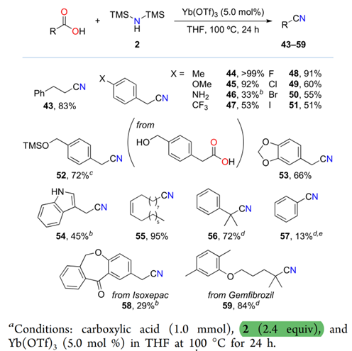 KEYWORDS: Lewis acid catalysis, amidation, dehydration (反应类型), C(sp2)-N, C(sp2)-C≡N (成键类型), Carboxylic Acids,TMS2NH(原料),amides, nitriles (产物), Yb(OTf)3, Hf(OTf)4(其他)