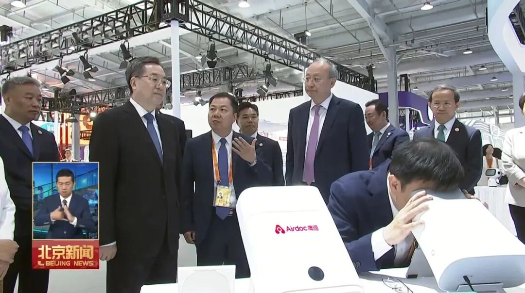 国务院副总理丁薛祥和北京市委书记尹力巡视服贸会,在鹰瞳Airdoc AI健康产品展台驻足。 北京卫视《北京新闻》报道: 2025年中国国际服务贸易交易会于9月10号在北京举行。中共中央政治局常委、国务院副总理丁薛祥出席全球服务贸易峰会并发表主旨讲话。峰会结束后,丁薛祥和尹力一起巡视服贸会展馆,在与参展单位负责人交流时,丁薛祥说:“中国将持续推进高水平对外开放,积极扩大优质服务进出口,为中外企业提供更多发展机遇,更好满足各国人民美好生活需要。” 丁薛祥副总理和北京市委书记尹力在健康卫生服务展区,听取了国家人工智能应用中试基地(医疗领域)的汇报。鹰瞳Airdoc作为国家人工智能应用中试基地(医疗领域)的合作生态之一,在本届服贸会展示了多款AI健康创新产品。 服贸会参会人员体验了鹰瞳Airdoc PBM视力康复仪、鹰瞳Airdoc视网膜慢病风险评估、鹰瞳Airdoc人工智能抗压能力监测等人工智能健康产品。鹰瞳Airdoc AI健康产品吸引了新华社、CCTV-2财经、央视新闻客户端、央广网、央视频等多家媒体记者的关注,并获得广泛关注与报道。