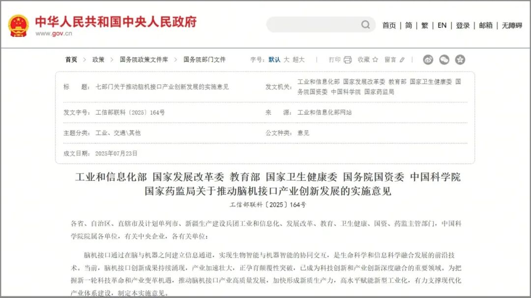 脑机接口通过在脑与机器之间建立信息通道,实现生物智能与机器智能的协同交互,是生命科学和信息科学融合发展的前沿技术。2025 年 7 月 23 日,工业和信息化部、国家发展改革委、教育部、国家卫生健康委等多部门联合发布了《关于推动脑机接口产业创新发展的实施意见》。