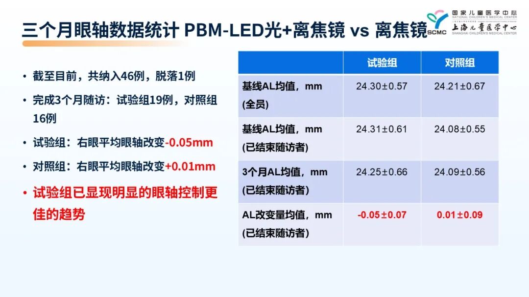 在中华医学会第二十九次眼科学术大会上,上海交通大学医学院附属上海儿童医学中心眼科刘红教授带来的题为《光生物调节应用于近视控制的研究》的报告中,即分享了上海儿童医学中心开展的一项前瞻性随机对照临床试验,试验组采用基于PBM光生物调节疗法、采用鹰瞳特殊设计的LED光疗方案(简称“PBM-LED光疗”)联合离焦镜,对照组则仅使用离焦镜。三个月的结果显示,试验组在眼轴控制方面相较于对照组展现出明显优势。