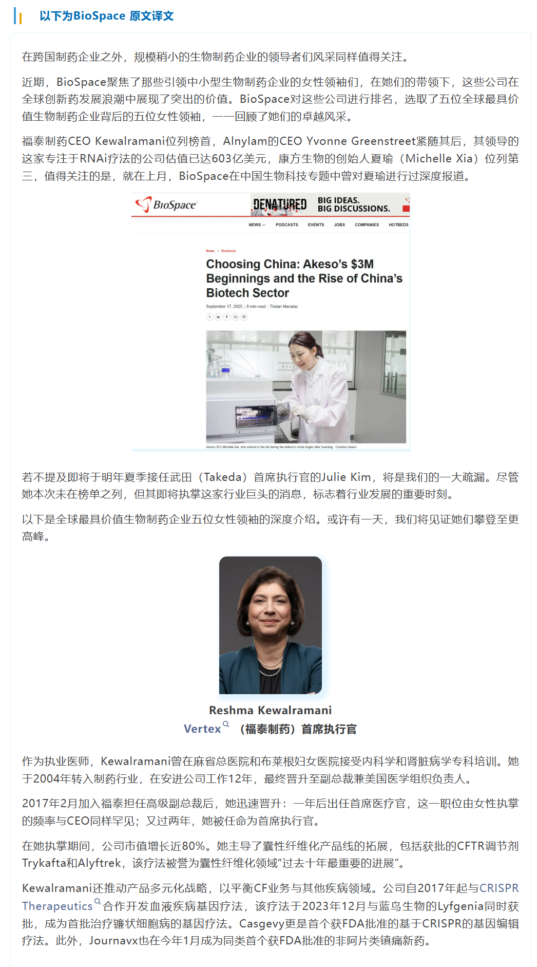 夏瑜博士入选 BioSpace “全球最具影响力五位生物制药企业女性领袖”榜单