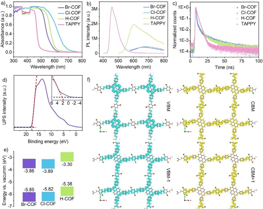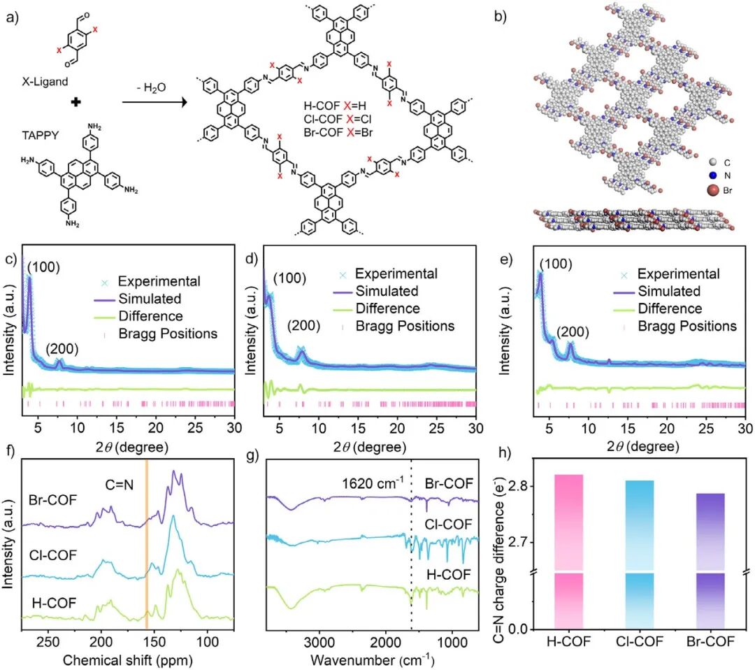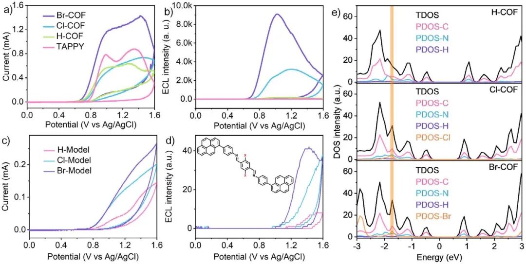 南京大学雷建平/中国科学技术大学武晓君/新加坡南洋理工大学赵彦利/南京师范大学吴丽娜研究团队在《Angewandte Chemie International Edition》上报道了一种共价卤化预设计策略,构建了一系列由对苯二甲醛邻位取代物与 1,3,6,8-四(4-氨基苯基)芘配体组成的卤化COFs纳米发光体,显著增强了骨架的p-π共轭效应。溴化COF的ECL强度较非卤化COF提升49倍,且部分溴化COFs的性能与卤素掺杂量呈正相关,证明了卤素共轭对电荷转移的促进作用。 如此显著的性能突破,离不开精准可靠的检测技术支持。本研究中,晶捷科技(Eaglenos Sciences, Inc., China)为本项研究提供的电致化学发光检测仪(ECL)以其卓越性能全程助力。 引言 研究背景 在电致化学发光(Electrochemiluminescence,ECL)中,发光体与共反应物/发光体的电化学中间体间的电荷转移形成激发态是关键机制,但传统发光体因孤立发光体与共反应物的随机碰撞导致电荷转移不可控,削弱了ECL强度。 共价有机框架(COFs)因长程电荷转移能力和稳定性成为潜力ECL发光体,但导电性低及亚胺键高极化性阻碍电子转移,导致ECL效率低。虽有调节网内电荷转移的尝试,但受限于结构单元,亟需普适性策略提升COFs的ECL性能。 主要内容 1.卤化 COFs 的设计合成与结构表征 研究通过共价卤化预设计策略,以1,3,6,8-四(4-氨基苯基)芘(TAPPY)为配体,分别与未取代、氯取代、溴取代的对苯二甲醛经席夫碱缩聚反应,合成了H-COF、Cl-COF和Br-COF。X射线衍射(PXRD)显示三者在3.67°~3.93°和7.72°~7.94°处有对应(100)和(200)晶面的强峰,证实高结晶性;固态¹³C CP/MAS光谱、FT-IR光谱及能量色散光谱(EDS)验证了亚胺键形成及卤原子的均匀分布;巴德电荷分析表明卤化降低了亚胺键的电荷差(Br-COF为2.78),减弱其极化,利于电荷传输。 图1. a) H-COF、Cl-COF、Br-COF 的合成示意图;b) Br-COF 顶部与侧面视图的模拟框架;c) H-COF、d) Cl-COF、e) Br-COF 的实验与模拟 PXRD 图谱;f) 三种 COF 的固态 ¹³C CP/MAS 核磁共振谱图;g) FT-IR 光谱图;h) 基于巴德电荷分析的三种 COF 中 C═N 键电荷差异图 2.卤化COFs的光学性质与电子结构分析 光学测试显示,卤化COFs的吸收边较TAPPY单体红移70~150 nm,Br-COF初始吸收始于 600 nm,表明电子离域增强;荧光发射波长红移(Br-COF为667 nm),且荧光寿命延长(Br-COF达15.15 ns),证实卤化提升电荷分离效率。紫外光电子能谱(UPS)和能级计算表明,卤化使价带顶(VBM)和导带底(CBM)能级加深(Br-COF的VBM为-5.85 eV,CBM为-3.86 eV),且CBM在二维骨架中离域,为电子沿碳骨架转移提供基础。 图2. a) TAPPY、H-COF、Cl-COF、Br-COF 的固态紫外 - 可见漫反射(UV–vis DRS)光谱;b) 上述四种物质的荧光发射光谱;c) 上述四种物质的时间相关单光子计数(TCSPC)曲线;d) Br-COF 的紫外光电子能谱(UPS);e) 三种 COF 的能级图;f) Br-COF 价带顶(VBM)、导带底(CBM)、VBM−1、CBM+1 的顶部视图电荷密度分布 3.卤化COFs及模型化合物的ECL行为研究 电化学测试显示,卤化COFs的氧化电位低于TAPPY(0.58 V vs 0.68 V),且Br-COF的ECL强度较H-COF提升49倍,Cl-COF提升17倍,证实卤化显著增强ECL性能。模型化合物(H-model、Cl-model、Br-model)的测试表明,其ECL信号远低于对应COFs(Br-model仅为Br-COF的0.46%),证明COFs的共轭框架放大了卤化增强效应。态密度分析显示,卤化使COFs出现新的能级峰,卤原子与碳原子的轨道贡献增强,窄化带隙。 图3. a) 含 20 mM TPrA 的 0.1 M PBS 中,TAPPY、H-COF、Cl-COF、Br-COF 修饰 GCE 的 CV 曲线;b) 上述修饰电极在同溶液(PMT=600 V)中的 ECL 曲线;c) 同溶液中模型化合物的 CV 曲线;d) 上述模型化合物在同溶液(PMT=600 V)中的 ECL 曲线;e) H-COF、Cl-COF、Br-COF 的总态密度(Total DOS)与元素分态密度(elemental partial DOS) 4.溴掺杂程度对COFs ECL性能的影响 通过调控溴配体与未取代配体的比例,制备了Br-COF₂₅、Br-COF₅₀、Br-COF₇₅和Br-COF,其溴原子占比分别为1.62%、3.32%、5.14%和6.51%。PXRD证实这些部分溴代COFs保持高结晶性;ECL测试显示,随溴掺杂程度增加,ECL强度逐渐增强,明确二者呈正相关,且电荷转移电阻降低,验证卤化通过提升骨架共轭促进网内电荷转移(IRCT)。 图4. a) Br-COF25、Br-COF50、Br-COF75、Br-COF 的溴原子占比;b) 上述四种物质的高分辨 Br 3d XPS 谱;c) H-COF、Br-COF25/50/75、Br-COF 的实验 PXRD 图谱;d) 上述五种物质修饰 GCE,在含 20 mM TPrA 的 0.1 M PBS(pH 7.4,PMT=600 V)中的 ECL 曲线 5.p-π共轭促进IRCT的机制解析 霍尔效应测试表明,Br-COF的载流子迁移率(7.1 cm2 V-1 s-1)和浓度(4.4×1014cm-3)高于H-COF,电子有效质量降低,证实卤化增强骨架共轭、加速 IRCT。太赫兹光谱及德鲁德-史密斯模型拟合显示Br-COF存在高效自由载流子传输;自然键轨道(NBO)分析表明,卤原子的p轨道与碳-碳反键轨道共轭,使反键轨道电子布居数增加(Br-COF为0.33),促进电子离域至芳香骨架。最终提出机制:卤化通过p-π共轭提升IRCT效率,增强阴阳离子自由基湮灭反应,从而提高ECL强度。 图5. a) 霍尔效应测得的载流子迁移率与浓度(插图:COF 片剂样品及器件图);b) COF 的电子有效质量;c) 支架与 Br-COF 的太赫兹(THz)光谱;d) 光导率 - 频率关系及 Drude–Smith 模型拟合线;e) Br-COF 中 C─X 键、C─C 反键的 NBO 图及等高线图(顶 / 侧面视图,绿、黄分指轨道正 / 负相位);f) 卤代促进 ECL 发光的 IRCT 示意图 技术简介 晶捷科技电致化学发光检测仪(ECL) 电致化学发光检测仪是研究电化学发光现象(ELECTROCHEMILUMINESCENCE,ECL)的理想选择,具备超灵敏、可便携以及多元化的优点。该仪器集电化学