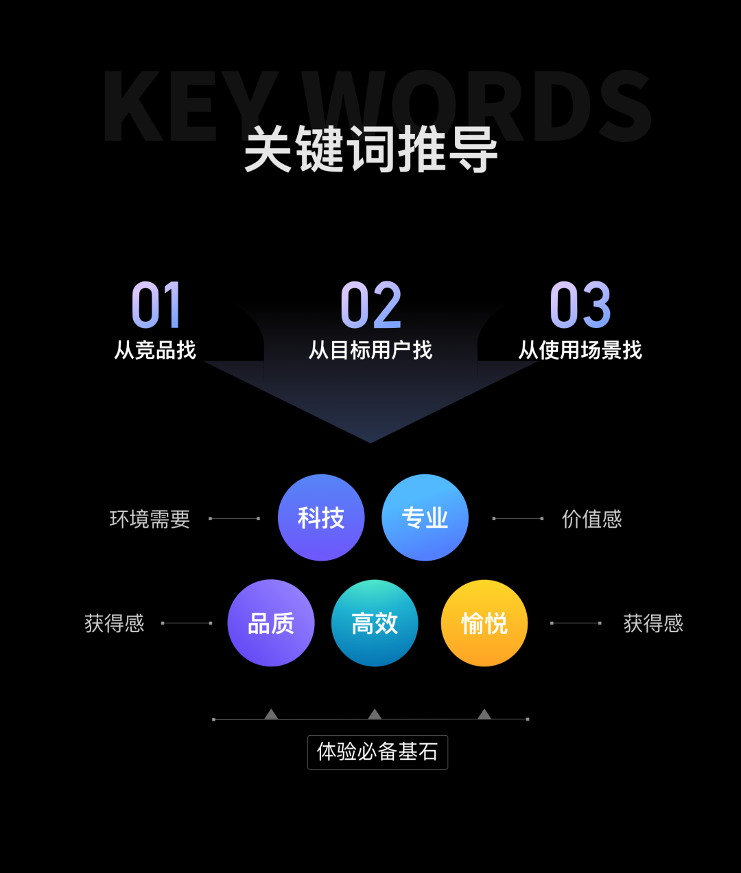 SAB 三类场景给用户传达不同的感受,加上产品定位的科技属性,因此我们制定出四大设计关键词:「科技」「专业」「愉悦」「品质」,在不同场景中灵活运用不同的设计策略组合,来构建不同的场景感受。