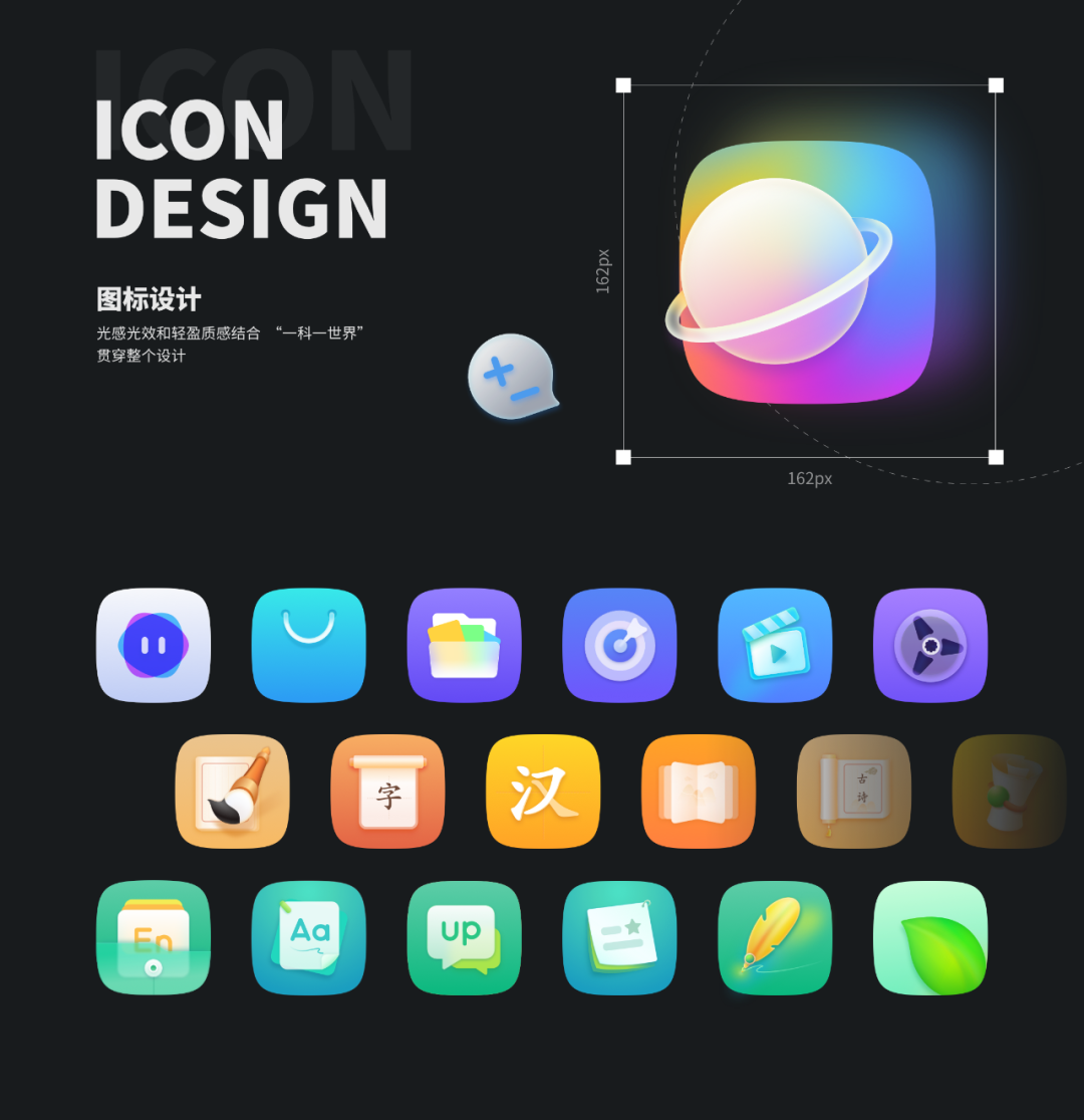在几十个系统图标的设计中,我们精雕每一个图标的细节,用颜色和图形进行学科归类,让用户更容易区分不同类别的图标属性,使用更得心应手。整体的平板在各个细节上都有考究,简洁一致的图标,运用「峰值体验原则」到各个场景的设计中,让用户首次使用时体会到物有所值感。