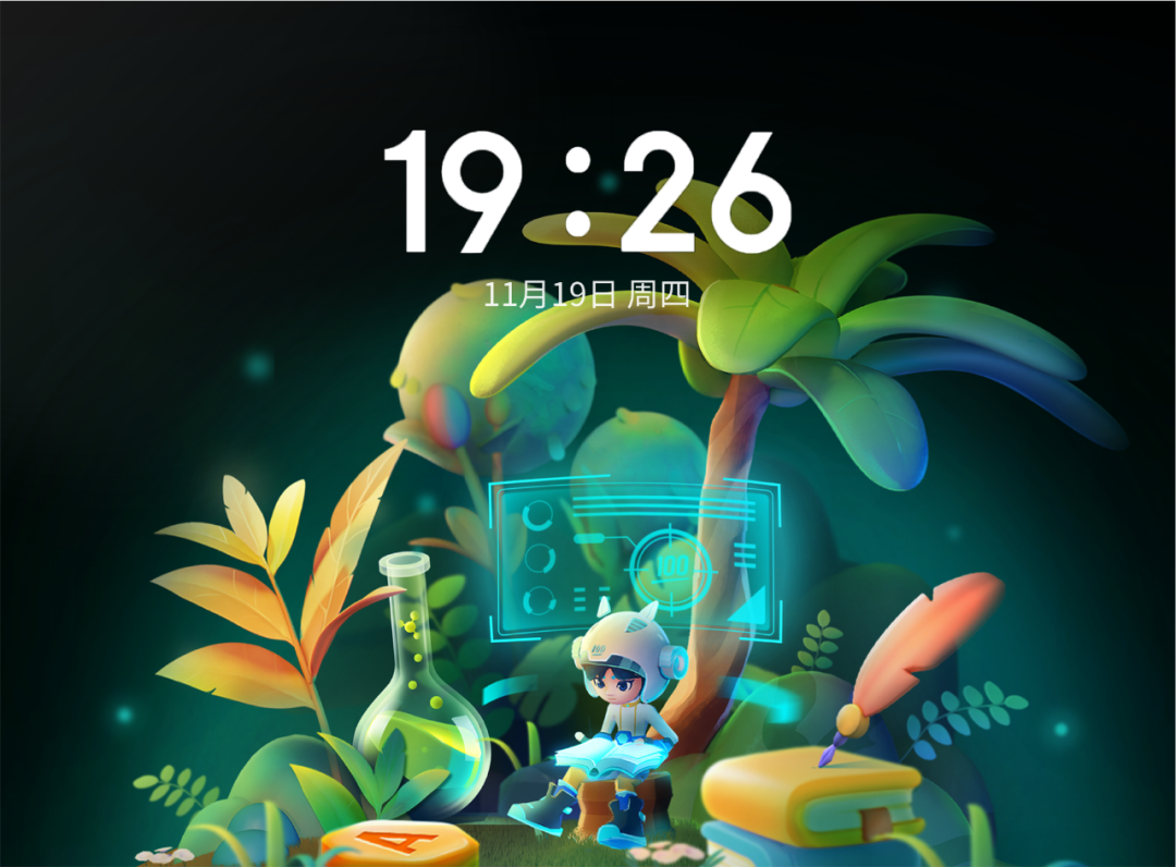 长时锁屏画面场景:锁屏画面采用绿色植物(护眼)+学习主题凸显类纸屏的特点,结合趣味性和护眼功能,并在画面中融入各个学科元素,在锁屏和进入正式使用界面的连接更亲密。