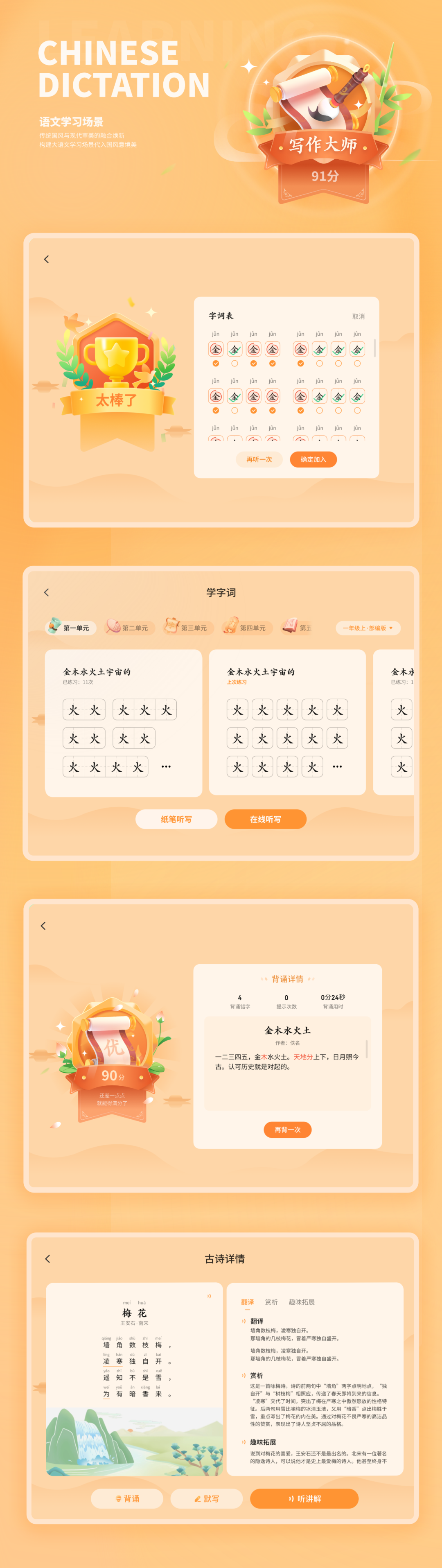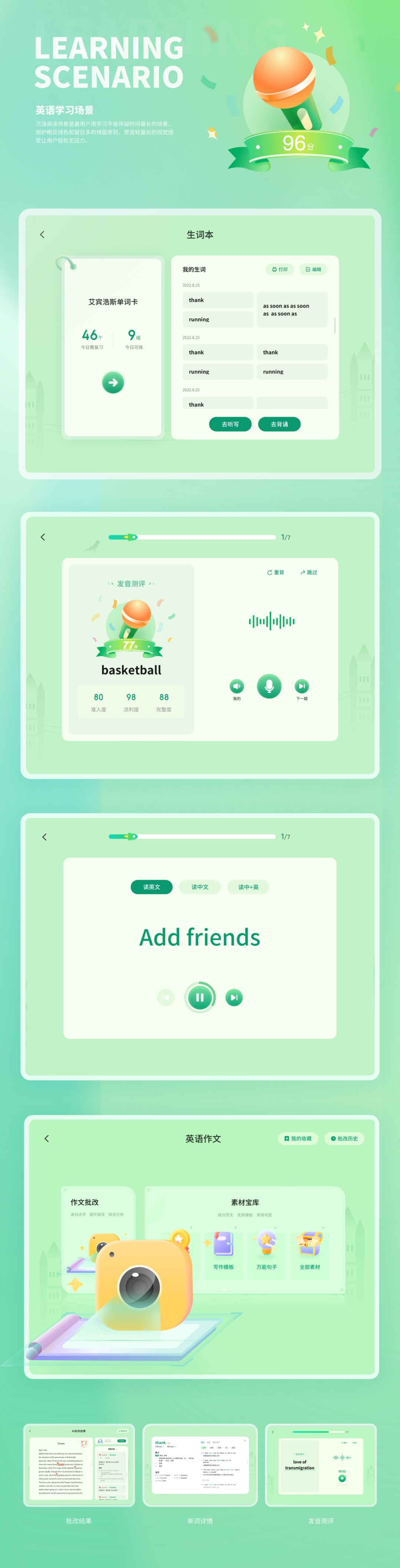 A类听说读写等学习界面:通过「弹性动态」「微拟物质感」「活泼音效」等策略增强学习趣味感;