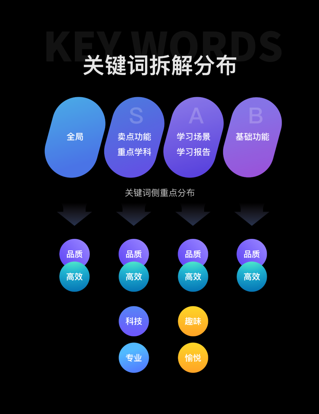 作业帮学习平板应用众多,我们按照功能分类结合用户场景和设计关键词一一对应,将众多应用分为 SAB 三个大类。