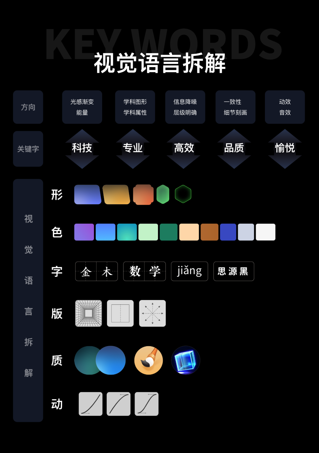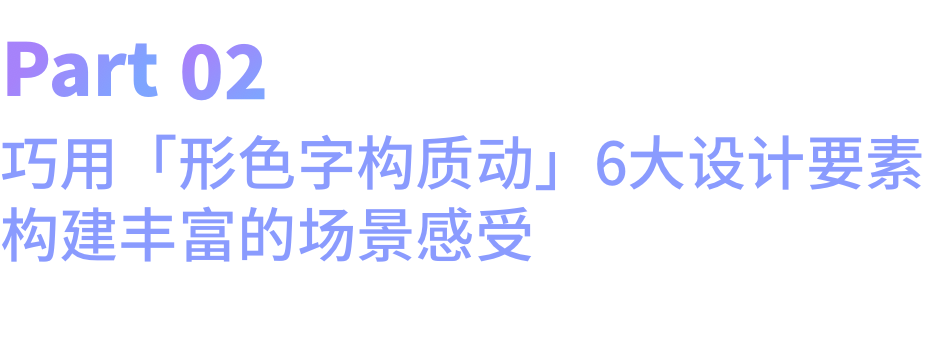 不同视觉感受的构建离不开六大类设计要素的组合:图形、颜色、字体、构成、质感、动效。在不同的场景中,综合运用「形色字构质动」的参数组合,可以构建不同场景需要的视觉感受。