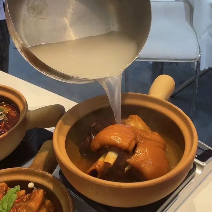 砂锅开盖瞬间,香气四溢,咕噜咕噜的汤汁炖煮食材,现场多重风味交织,瞬间吸引了众多参展人员驻足品尝咨询。