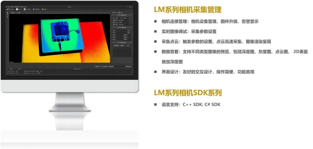 专为LM系列相机开发的客户端程序,支持实时预览、参数配置、标定、数据保存、升级固件等功能。