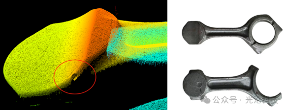 铸造加工:发动机连杆缺陷检测,技术要求:检测发动机连杆铸造磕碰划伤等缺陷。检测标准:磕碰划伤深度>0.2mm