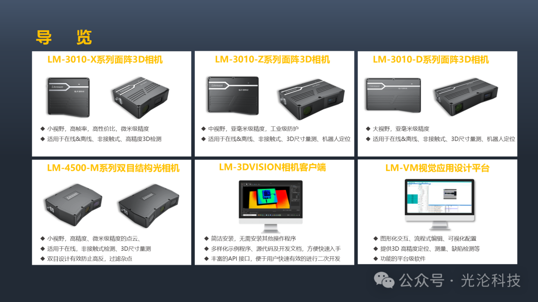 适用于3C、锂电、PCB 等行业中的在线、非接触式、高精度3D 测量应用场景,机械臂高精度定位引导。