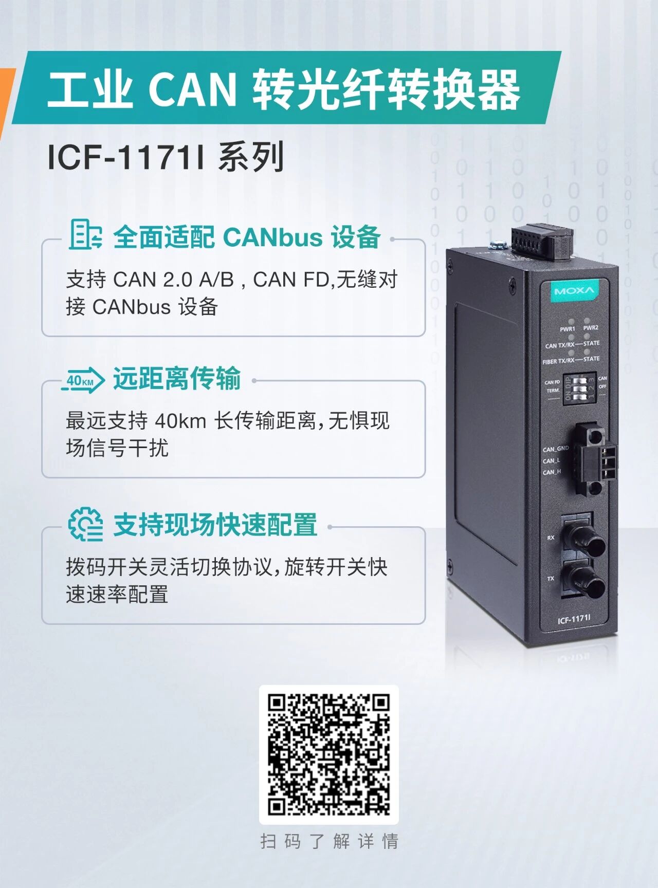 Moxa ICF-11711 系列提供更可靠高效通信,扫描二维码,了解产品详情!
