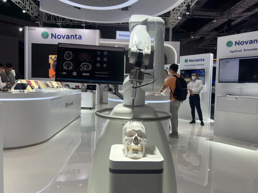 本次我们展示的神外手术机器人工作站,机械臂悬停在模拟头颅上方,末端手术工具正以0.01mm/s的速度“探入”虚拟脑组织,屏幕同步显示力反馈曲线——这是ATI联合医疗合作伙伴开发的神外手术机器人工作站。