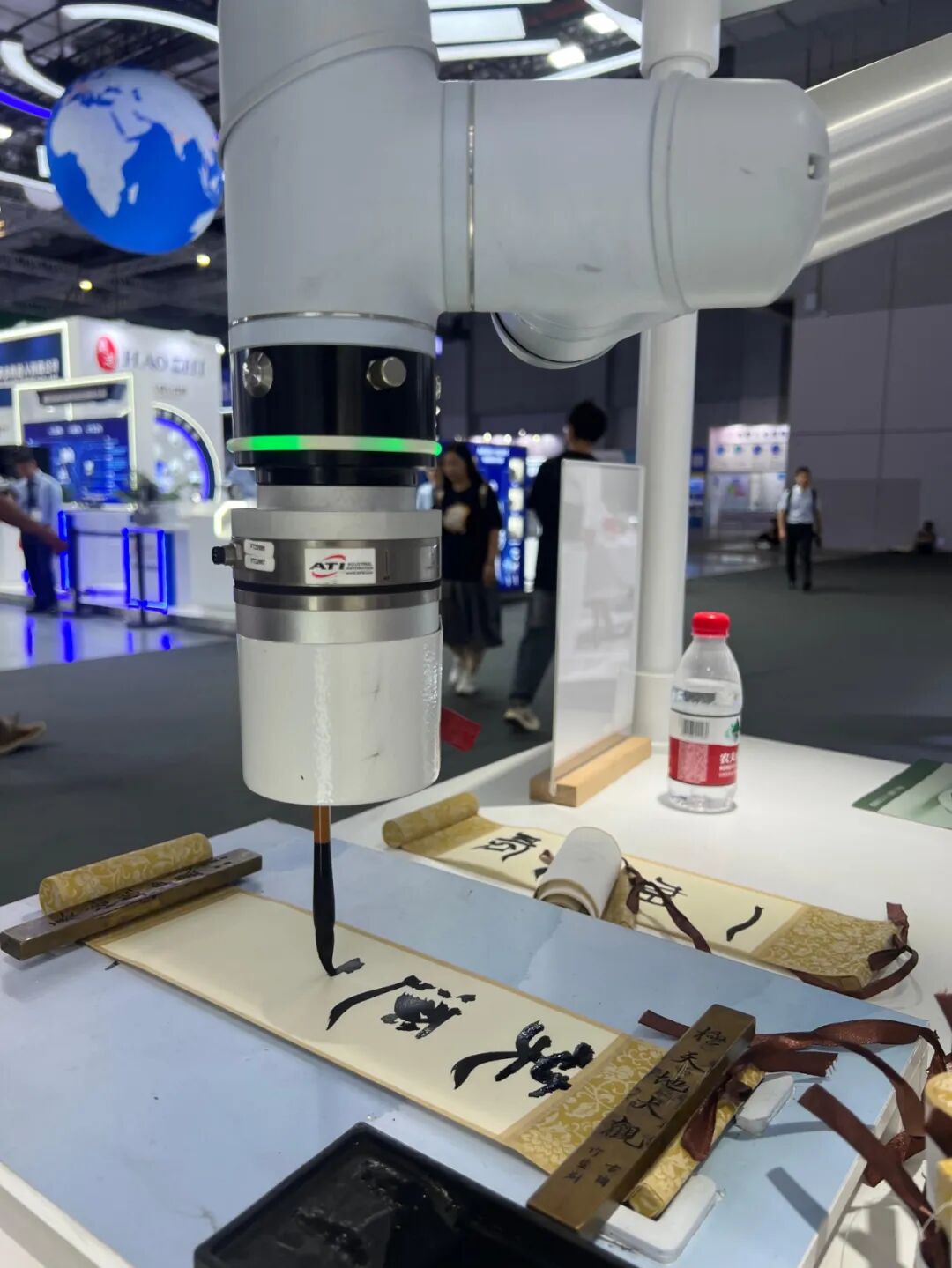 机器人书法家,本次我们展示了具有互动性质的AI+力控机器人书法家,正悬腕写“前程似锦”四个大字,笔锋转折处力道均匀,连“点”的顿挫都像模像样。“书法是最考验力控精度的人类技能之一:提按、转折、轻重,全靠手指对笔的掌控力。我们的机器人通过力控传感器+轨迹规划算法,能复现专业书法家的运笔逻辑,本质是在验证‘柔性力控’的上限。”
